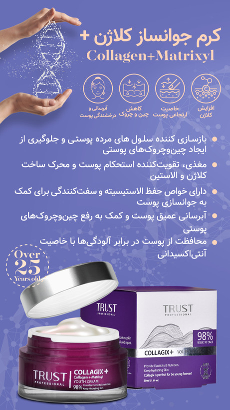و در نهایت، پلی پپتاید آرژینین و لایزین موجود در کرم جوانساز کلاژن تراست، از ایجاد چینوچروک در پوست جلوگیری کرده و به حفظ شادابی و سلامت پوست کمک میکند. در کنار مواد مؤثره مطرحشده، این محصول تراست، با عصاره دانه لوپینوس آلبوس، به حفظ استحکام و افزایش خاصیت کشسانی پوست، با آسپارلین، به بهبود سوختوساز سلولهای پوستی و تکثیر آنها، با روغن آووکادو، به حفظ استحکام و پایداری پوست و با هلیانتوس آنوس سید اویل، به بهبود آبرسانی و جلوگیری از پیری پوست، کمک میکند.